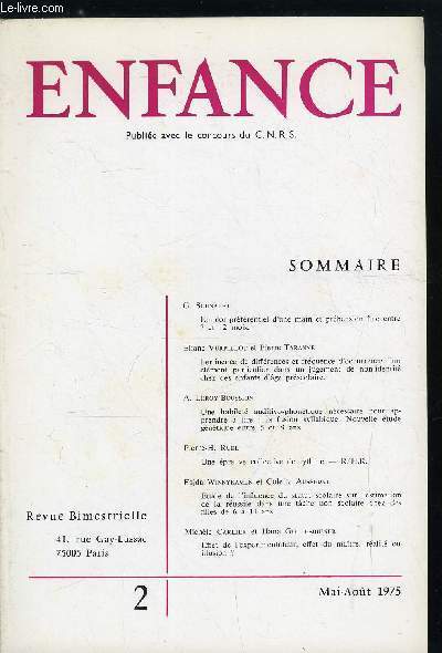 Sommaire : Emploi préférentiel d'une main et préhension fine entre 7 et 12 mois par G. Sounalet, Pertinence de différences et fréquence d'occurence d'un élément particulier dans un jugement de non identité chez des enfants d'age préscolaire par Eliane Vurpillot et Pierre Taranne, Une habileté auditivo-phonétique nécessaire pour apprendre a lire : la fusion syllabique, nouvelle étude génétique entre 5 et 8 ans par A. Leroy-Boussion Classification Dewey : 155.4-Psychologie de l'enfant
