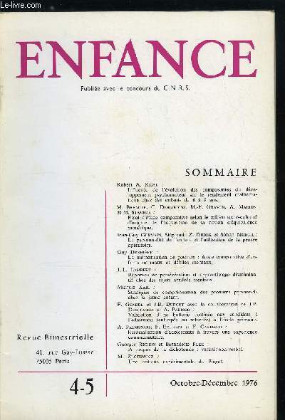 Presses universitaires de france. Oct-Dec 1976. In-12. Broché. Bon état, Couv. convenable, Dos satisfaisant, Intérieur frais. Paginé de 349 à 518.. . . . Classification Dewey : 155.4-Psychologie de l'enfant