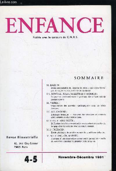 Sommaire : Etude comparative de l'atteinte du niveau opératoire formel par des sujets sourds profonds de naissance par M. Bartin, Le premier environnement linguistique des enfants nés de parents sourds par J.A. Rondal, Julia Maestras y Moores, Organisation des activités prélogiques chez les bébés iraniens par M. Verba Classification Dewey : 155.4-Psychologie de l'enfant