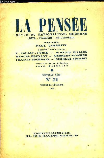 Sommaire : Paul Langevin par Georges Cogniot, André Jdanov et la responsabilité de l'intellectuel par Pierre Hentgès, Un débat scientifique en Union Soviétique par Marcel Prenant, L'oeuvre de Lyssenko et l'évolution de la génétique par Jeanne Lévy, La psychanalyse est une thérapeutique par Docteur Serge Lebovici, Destin de la psychanalyse par le docteur Victor Lafitte Classification Dewey : 100-PHILOSOPHIE ET DISCIPLINES CONNEXES