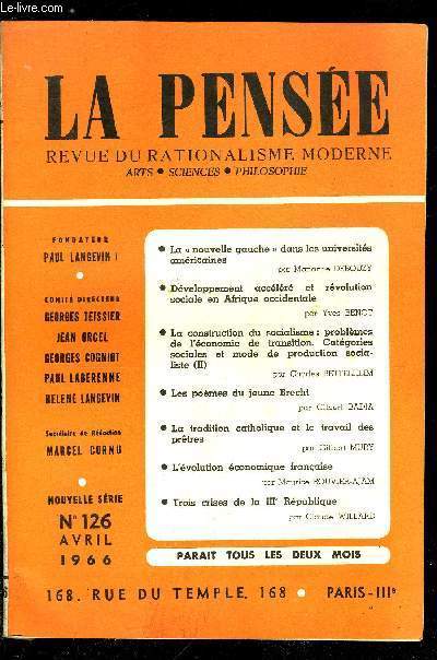 Sommaire : La nouvelle gauche dans les universités américaines par Marianne Debouzy, Développement accéléré et révolution sociale en Afrique occidentale par Yves Benot, Problèmes de l'économie de transition : catégories sociales et mode de production socialiste (II) par Charles Bettelheim, Les poèmes du jeune Brecht (1917-1929) par Gilbert Badia Classification Dewey : 100-PHILOSOPHIE ET DISCIPLINES CONNEXES