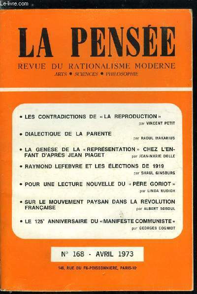 Sommaire : Les contradictions de la reproduction par Vincent Petit, Dialectique de la parenté par Raoul Makarius, La genèse de la représentation chez l'enfant d'après Jean Piaget, Raymond Lefebvre et les élections de 1919 par Shaul Ginsburg, Pour une lecture nouvelle du père Goriot par Linda Rudich, Sur le mouvement paysan dans la révolution française par Albert Soboul Classification Dewey : 100-PHILOSOPHIE ET DISCIPLINES CONNEXES