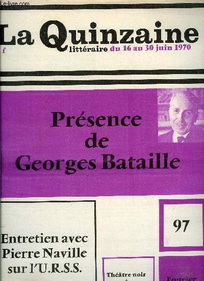 Sommaire : Andréas et autres récis par Diane Fernandez, Bataille parait par Denis Hollier, Entretien avec Roger Caillois par Gilles Lapouge, L'illimité de la pensée par Maurice Blanchot, Les dames de Bataille par Jean Schuster, Bataille forcé par Lucette Finas Classification Dewey : 809-Histoire, littérature