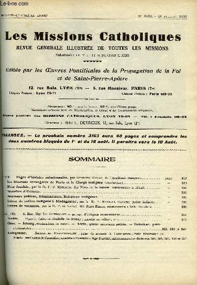 Bureaux des Missions Catholiques. 16 juillet 1932. In-12. Broché. Bon état, Couv. convenable, Dos satisfaisant, Intérieur frais. Paginé de 317 à 340. Texte en colonnes. Quelques illustrations en noir et blanc dans et hors texte.. . . . Classification Dewey : 234-La foi