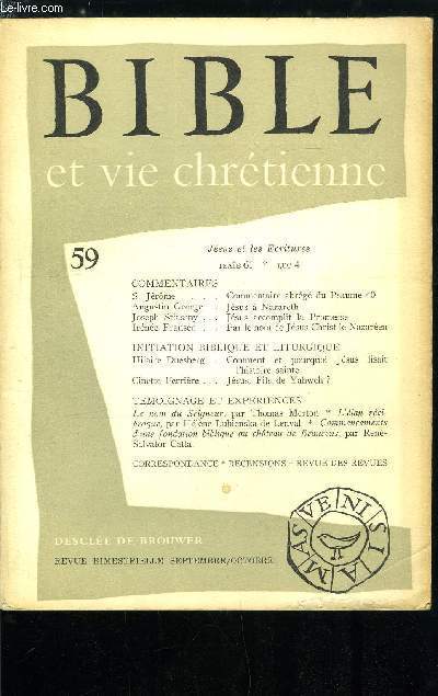 Sommaire : En tête du livre, commentaire abrégé du Psaume 40 par S. Jérome, La prédication inaugurale de Jésus dans la synagogue de Nazareth (Luc 4, 16-30) par Augustin George, Jésus accomplit la Promesse essai d'interprétation de Matthieu 5, 17-19 par Joseph Stiassny Classification Dewey : 200-RELIGION