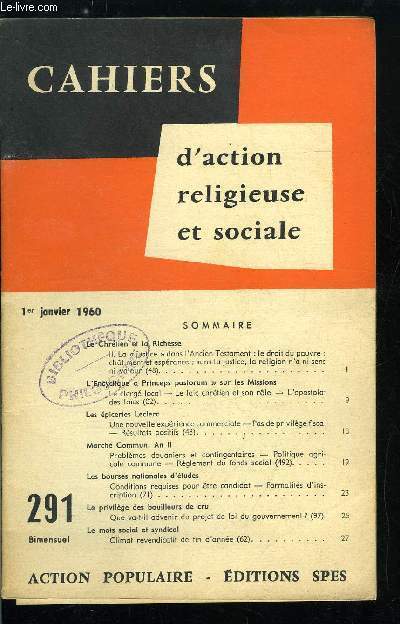 Sommaire : Le chrétien et la richesse, L'encyclique Princeps pastorum sur les missions, Les épiceries Leclerc, Marché commun, an II, Les bourses nationales d'études, Le privilège des bouilleurs de cru, Le mois social et syndical Classification Dewey : 260-Théologie sociale chrétienne