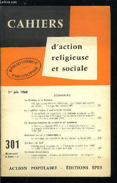 Sommaire : Le chrétien et la richesse, les comportements individuels : la critique des sources de revenu, La pétition laïque contre la loi scolaire, De diverses manières a considérer un problème, Bouilleurs de cru inamovibles Classification Dewey : 260-Théologie sociale chrétienne