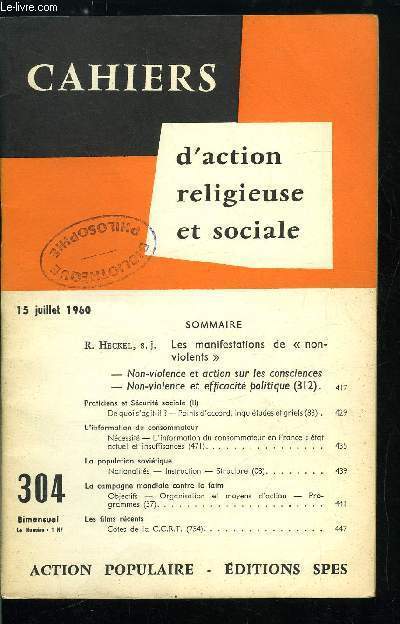 Sommaire : Les manifestations de non-violents par R. Heckel, Non violence et action sur les consciences, Non violence et efficacité politique, Praticiens et sécurité sociale, De quoi s'agit il ?, L'information du consommateur, La population soviétique Classification Dewey : 260-Théologie sociale chrétienne