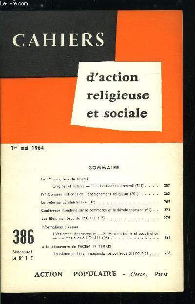 Sommaire : Le 1er mai, fête du travail, origines et histoire, fête chrétienne du travail, IVe congrès national de l'enseignement religieux, La réforme administrative, Conférence mondiale sur le commerce et le développement, Les Etats membres de l'O.N.U. Classification Dewey : 260-Théologie sociale chrétienne