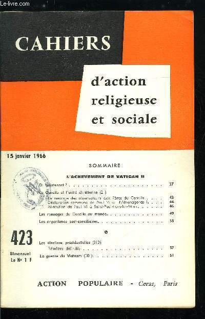 Bureau de la revue. 15 janvier 1966. In-12. Broché. Bon état, Couv. convenable, Dos satisfaisant, Intérieur frais. Paginé de 37 à 68.. . . . Classification Dewey : 260-Théologie sociale chrétienne