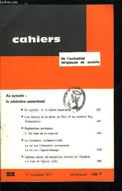 Sommaire : Au synode : le ministère sacerdotal, Une lecture de la lettre de Paul VI au cardinal Roy, Recherches politiques, du coté de la majorité, La formation professionnelle, La loi sur l'éducation permanente, La loi sur l'apprentissage Classification Dewey : 260-Théologie sociale chrétienne