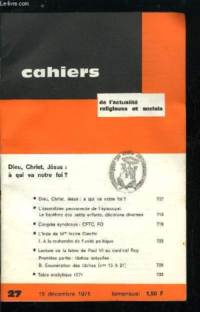 Sommaire : Dieu, Christ, Jésus : a qui va notre foi ?, L'assemblée permanente de l'épiscopat, le baptême des petits enfants, décisions diverses, Congrès syndicaux : CFTC, FO, L'Inde de Mme Indira Gandhi, A la recherche de l'unité politique Classification Dewey : 260-Théologie sociale chrétienne
