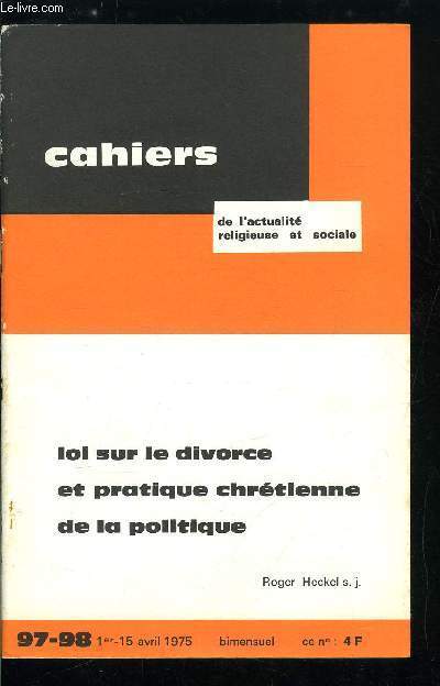 10 vol. in-12 br., Cahiers de l'Actualité Religieuse et Sociale, Paris, 1975, 351 pp. numérotées en continu. Rappel des titres de cette série : n° 91 Prendra-t-on au sérieux la lutte contre la faim ? n° 92 Réconciliation dans l'église ; 93 Dossier A. Soljenitsyne ; 94 Dossier L'expérience du croyant ; 95 Quand vient l'heure de mourir ; 96 La politique familiale ; 97-98 Loi sur le divorce et pratique chrétienne de la politique ; 99 André Manaranche , l'idéologie et l'aveu ; 100 Quand l'apôtre Paul parle aux Eglises ; 101 Vers le débat sur le divorce
