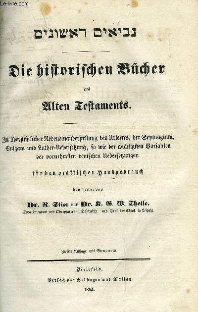 Berlag von Belhagen und Rlafing. 1854. In-4. Relié. Bon état, Couv. convenable, Dos satisfaisant, Intérieur frais. 6 volumes en grecque, hébreu, allemand et latin. Titres en doré sur le dos. 3 photos disponibles.. . . . Classification Dewey : 200-RELIGION