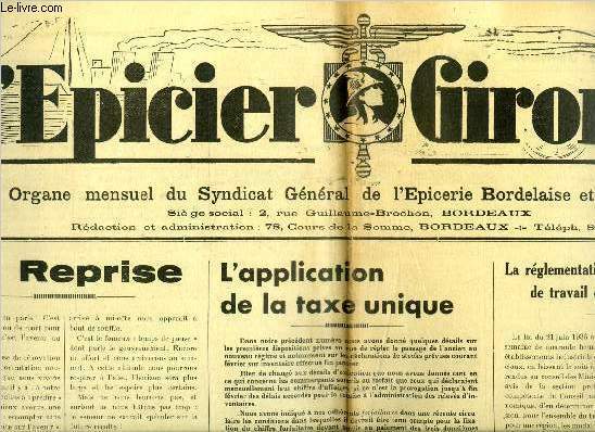 Sommaire : La reprise par R. Cossaune, Un grave danger, L'application de la taxe unique par E.M., La réglementation de la durée de la semaine de travail dans l'épicerie en détail, Légion d'honneur, Distinction méritée, La semaine de 40 heures, notre président répond a l'enquête du Ministre Classification Dewey : 908.447-Régionalisme : Aquitaine
