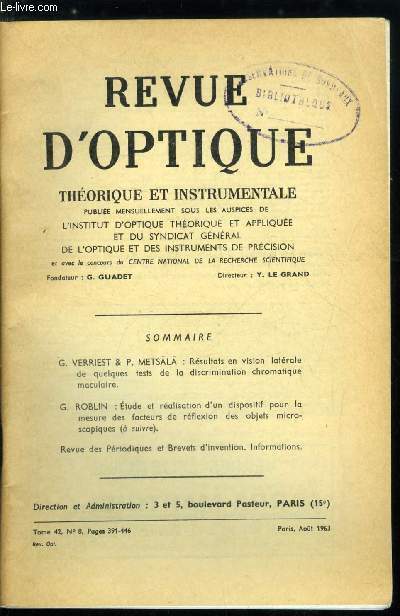 Sommaire : Résultats en vision latérale de quelques tests de la discrimination chromatique maculaire par G. Verriest et P. Metsala, Etude et réalisation d'un dispositif pour la mesure des facteurs de réflexion des objets microscopiques par G. Roblin Classification Dewey : 620-Art de l'ingénieur et activités connexes