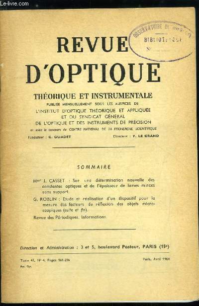 Sommaire : Sur une détermination nouvelle des constantes optiques et de l'épaisseur de lames minces sans support par J. Casset, Etude et réalisation d'un dispositif pour la mesure des facteurs de réflexion des objets microscopiques par G. Roblin Classification Dewey : 620-Art de l'ingénieur et activités connexes