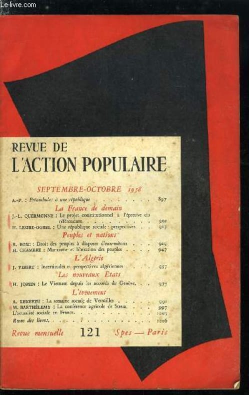 Sommaire : Préambules a une république par A.P., Le projet constitutionnel a l'épreuve du référendum par J.L. Quermonne, Une république sociale : perspectives par H. Lesire-Ogrel, Droit des peuples a disposer d'eux mêmes par R. Bosc, Marxisme et libération des peuples par H. Chambre, Incertitudes et perspectives algériennes par J. Vibert Classification Dewey : 260-Théologie sociale chrétienne