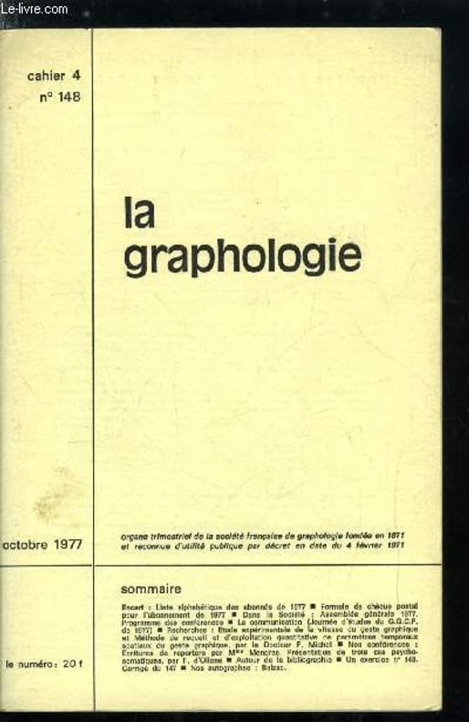 Société française de graphologie. Octobre 1977. In-12. Broché. Bon état, Couv. convenable, Dos satisfaisant, Intérieur frais. 76 pages.. . . . Classification Dewey : 155.2-Psychologie individuelle