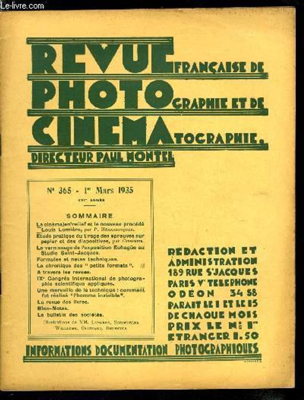 Bureau de la revue. 1er mars 1935. In-12. Broché. Bon état, Couv. convenable, Dos satisfaisant, Intérieur frais. Paginé de 65 à 80. Quelques photographies en noir et blanc dans et hors texte.. . . . Classification Dewey : 770-Photographie