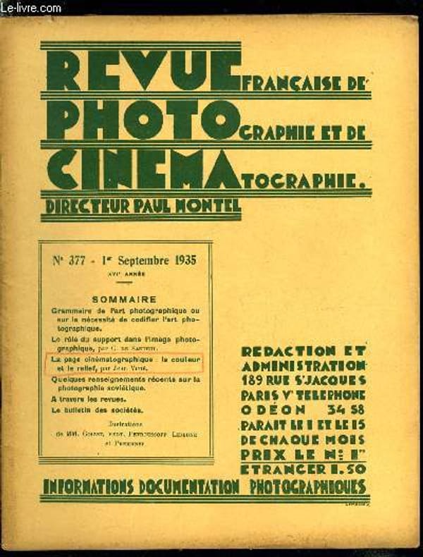Bureau de la revue. 1er septembre 1935. In-12. Broché. Bon état, Couv. convenable, Dos satisfaisant, Intérieur frais. Paginé de 257 à 272. Quelques photographies en noir et blanc dans et hors texte.. . . . Classification Dewey : 770-Photographie