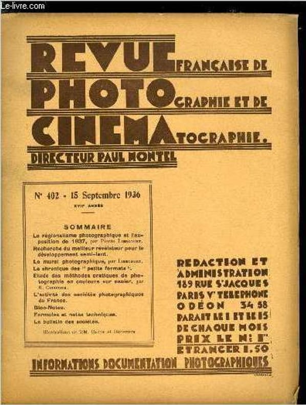 Bureau de la revue. 15 septembre 1936. In-12. Broché. Bon état, Couv. convenable, Dos satisfaisant, Intérieur frais. Paginé de 273 à 288. Quelques photographies en noir et blanc dans et hors texte.. . . . Classification Dewey : 770-Photographie