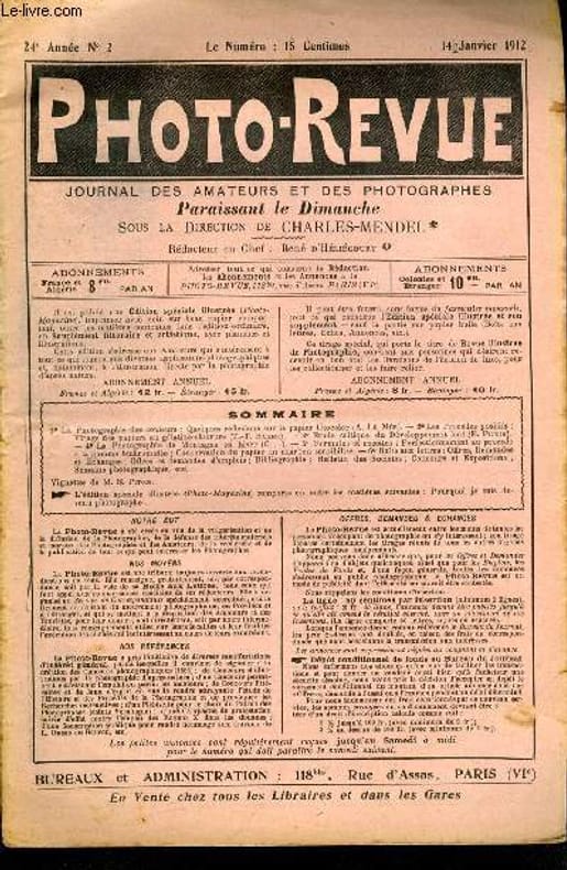 Bureau de la revue. 14 janvier 1912. In-12. Broché. Bon état, Couv. convenable, Dos satisfaisant, Intérieur frais. Paginé de 9 à 16. Texte en colonnes.. . . . Classification Dewey : 770-Photographie