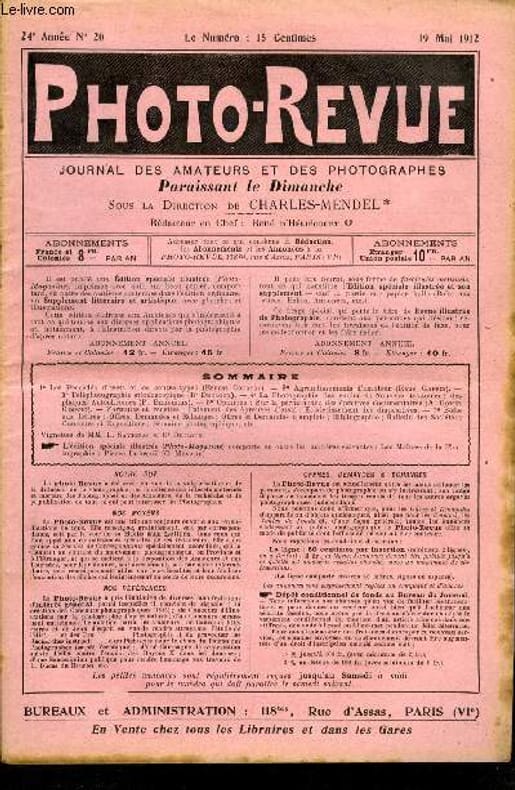 Bureau de la revue. 19 mai 1912. In-12. Broché. Bon état, Couv. convenable, Dos satisfaisant, Intérieur frais. Paginé de 153 à 160. Texte en colonnes.. . . . Classification Dewey : 770-Photographie
