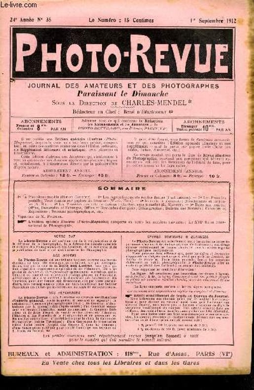 Bureau de la revue. 1er septembre 1912. In-12. Broché. Bon état, Couv. convenable, Dos satisfaisant, Intérieur frais. Paginé de 65 à 72. Texte en colonnes.. . . . Classification Dewey : 770-Photographie