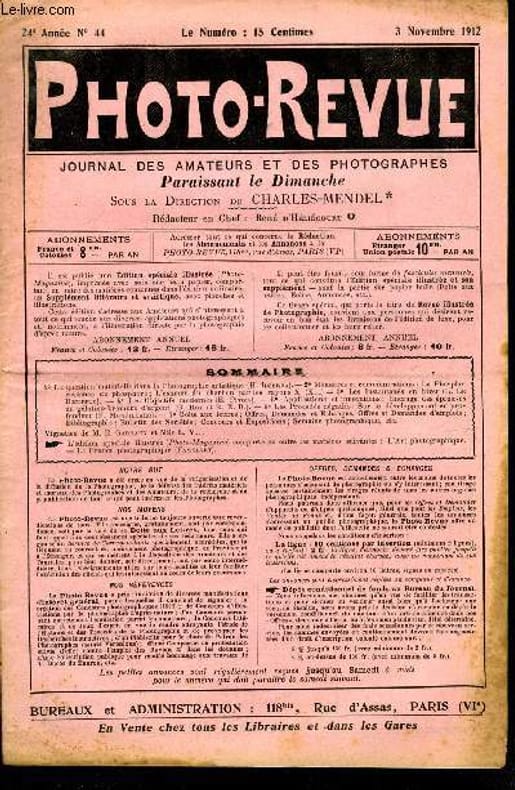 Bureau de la revue. 3 novembre 1912. In-12. Broché. Bon état, Couv. convenable, Dos satisfaisant, Intérieur frais. Paginé de 137 à 144. Texte en colonnes.. . . . Classification Dewey : 770-Photographie