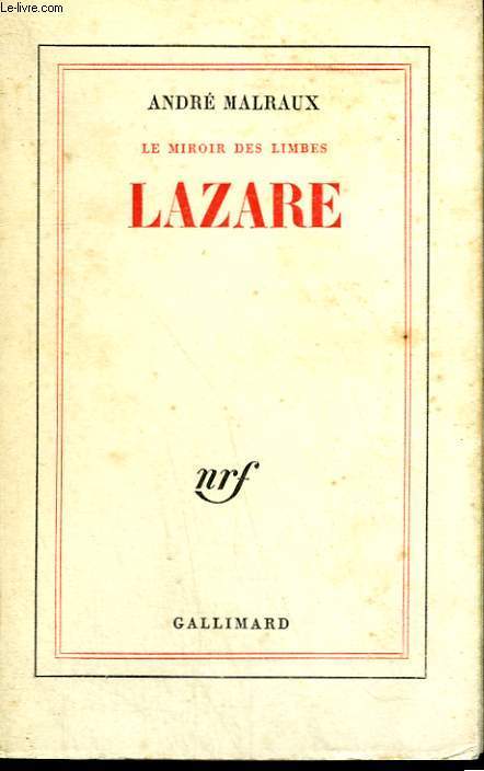 Lazare, surtitré Le Miroir des limbes du nom du cycle littéraire auquel il est associé, est un essai et un récit autobiographique d'André Malraux paru le 25 octobre 1974 aux éditions Gallimard. Ce récit expose l'hospitalisation de son auteur, « atteint d'une maladie du sommeil », à l'hôpital de la Salpêtrière en 1972 et ses discussions avec son psychiatre traitant, Louis Bertagna1. Ce livre — dont le titre fait référence à la résurrection et la sortie de tombeau de Lazare de Béthanie est dédié à Christian Fouchet qui venait de mourir quelques semaines avant la parution — clôt le cycle du Miroir des limbes constituant les mémoires de l'auteur. vol broché, usures d'usage, très bel état, 18x13, 252pages. Exemplaire de service de presse Paris, Gallimard, 1974. Edition Originale ref/271