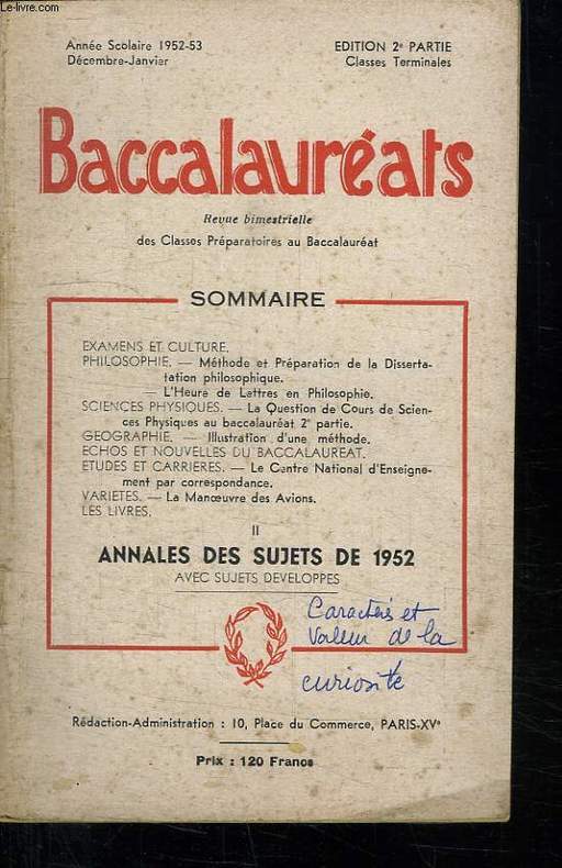 CHEZ L AUTEUR.. 1952 - 1953. In-12. Broché. Bon état, Couv. légèrement passée, Dos satisfaisant, Intérieur acceptable. 63 pages. Nombreuses notes au stylo dans la marge et dans le texte ainsi que sur le premier plat de couverture.. . . . Classification Dewey : 370-Education