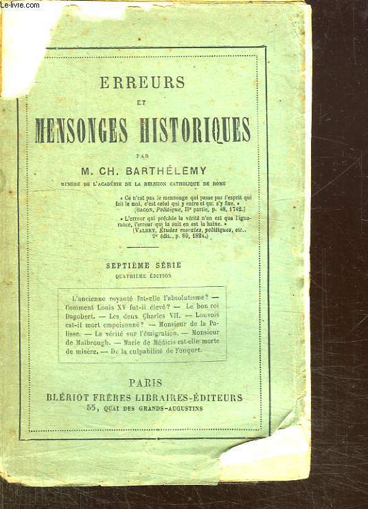 Septième Série : L'ancienne royauté fut-elle l'absolutisme ? - Comment Louis XV fut-il élevé ? - Le bon roi Dagobert - Les deux Charles VII - Louvois est-il mort empoisonné ? - Monsieur de La Palisse - La vérité sur l'émigration - Monsieur d'Malbrough - Marie de Médicis est-elle morte de misère ? - De la culpabilité de Fouquet. Neuvième Série : Les mystères de Venise - L'impératrice Marie-Thérèse et Madame de Pompadour - La paix et le trève de Dieu - A propos des Vandales et du Vandalisme - Nous n'irons pas à Canossa - La vérité sur Télémaque - Les guerres de religion - Le religion de la Fontaine - Latude - Cervantès, libre penseur - La politique et l'indépendance de Clovis. Dixième Série : Le roman de Christophe Colomb - La mort du Corrège - Dante fut-il un hérétique et un révolutionnaire ? - La sainte Hermandad - Etienne Marcel - Le caractère de Charles V, dit le Sage. PHOTOS sur DEMANDE. ...................... Photos sur demande ..........................