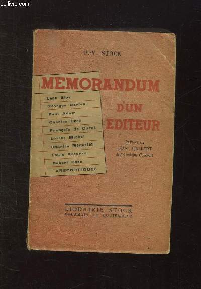 ed. Libraire Stock 1935 in-12 br., preface de Jean AJALBERT, sur L. BLOY, G.DARIEN, P.ADAM. C.CROS, F.de SUREL, L.MICHEL, C.MONSELET, etc. etc. et plein d’anecdotes, documents hors-texte, index des noms cites, dos jauni, Memorandum d’un editeur (deuxieme serie), ed. Librairie Stock, 1936, sur H. BECQUE, G.CLEMENCEAU, G.NADEAU, COQUELIN Cadet, G.de MAUPASSANT, VILLIERS de L’ISLE ADAM, E.GUILLAUMIN, et plethores de confidences, documents hors-texte, index des noms cites, non coupe, Memorandum d’un editeur (Troisieme serie), l’Affaire Dreyfus, ed. Stock, 1938, in-12 br., documents hors-texte, index des noms cites, dos bruni, dans chaque volume nombreuses lettres des auteurs, nous sommes vraiment dans les coulisses de l’ed. où l’on voit que ce n’est pas un metier de tout repos, les 3 volumes avec mention d’ed. mais annees de l’edition originale, on joint un petit mot manuscrit de P.V. STOCK à un ecrivain et critique suite à l’envoi d’une plaquette de ce dernier conservee dans l’enveloppe d’origine à l’enseigne du libraire-editeur, ainsi que l’ouvrage paru en 1981 de Christian de BARTILLAT (alors directeur des editions) Stock 1708-1981, trois siecles d’invention suivi de Une approche historique par Alain de GOURCUFF et Marc PRIGENT, in-8 br., edition originale (il n’est pas annonce de grand papier), l’ensemble