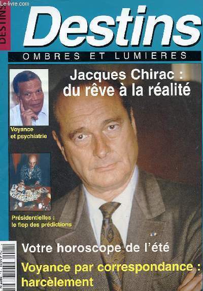 "Sommaire : politique ""Jacques Chirac du rêve à la réalité"", ""présidentielles le flop des prédictions"" - Interview "" voyance et psychiatrie"" - Spiritualité ""géométrie du dessin les degrés de la Cabbale"" - Droit ""Justice en France"" - Peinture ""Van Gogh ou le feu devasteur"".... Classification Dewey : 70-Journalisme, édition. Journaux"