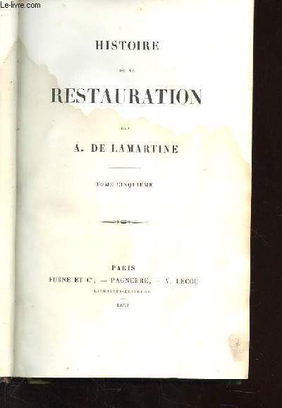 Histoire de la Restauration, Tome I - VIII Tome Premier : Restauration de 1814 - Cent Jours, 624 pp Tome Deuxième : Restauration de 1814 - Cent Jours, 675 pp avec carte dépliante Tome Troisième : Régne de Louis XVIII - Chambre de 1815, 664 pp , 1863 Tome Quatrième : Régne de Louis XVIII - Ministère Richelieu et Decazes, 555 pp, 1865 Tome Cinquième : Régne de Louis XVIII, 671 pp, 1866 Tome Sixième : Régne de Louis XVIII, Ministère de M De Villèle - Première phase ( dec 1821 - sept 1824 ), 796 pp, 1868 Tome Septième : Régne de Charles X , seconde phase ( sept 1824 - jan 1828 ) 651 pp , 1869 Tome Huitième : Régne de Charles X ( jan 1928 - juil 1830 - révolution de juillet )754 pp , 1872 22 x 15 cm, reliure demi-cuir vert foncée, dos à 4 nerfs orné, bon état