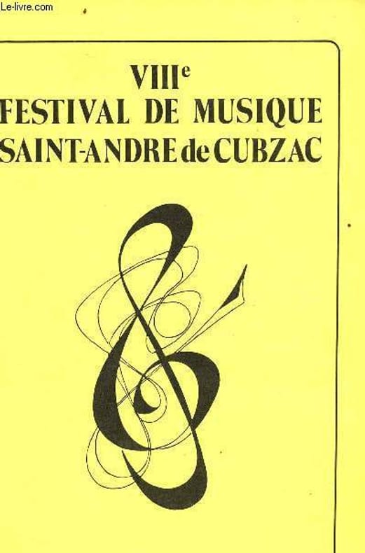 "Imprimerie Savignac. 1985. In-8. Broché. Bon état, Couv. convenable, Dos satisfaisant, Intérieur frais. Programme de 34 pages - quelques photos en noir et blanc dans et hors texte - en supplément un dépliant ""VIIIe festival de musique Saint-Andre-De-Cubzac-du 22 au 28 avril 85"". . . . Classification Dewey : 780-Musique"