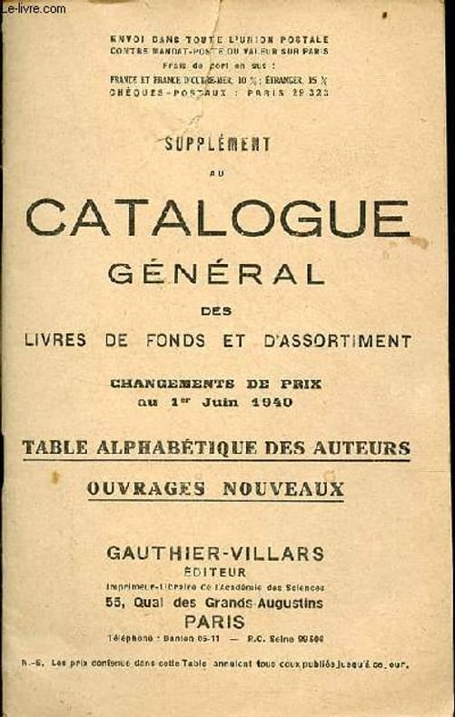 Gauthier-villars. 1940. In-8. Broché. Etat d'usage, 1er plat abîmé, Agrafes rouillées, Papier jauni. Paginé de 465 à 520 - texte sur deux colonnes - déchirure sur le 1er plat.. . . . Classification Dewey : 56-Catalogue