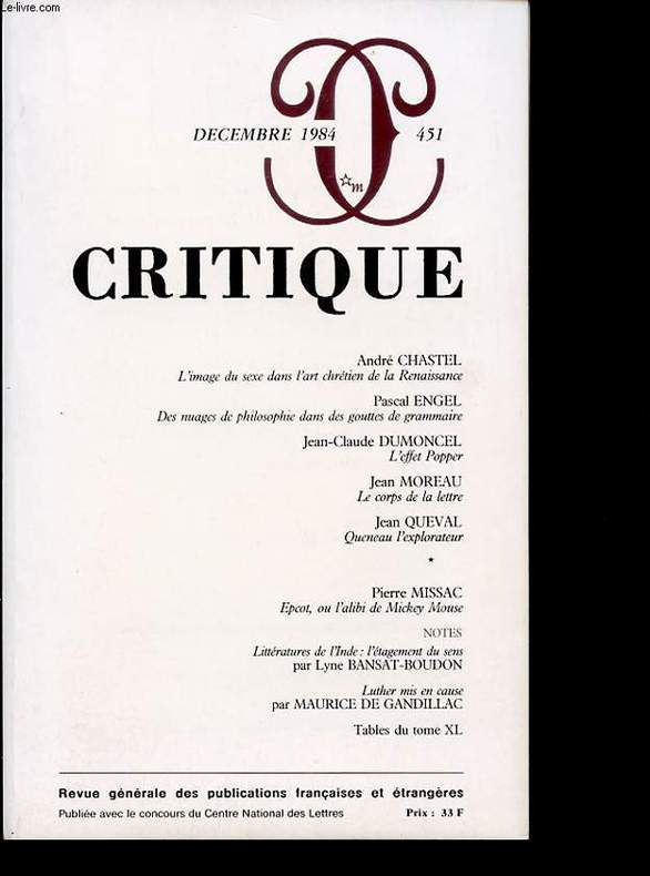 Revue générale des publications française et étrangères. L image du sexe dans l art chrétien de la renaissance. Des nuages de philosophie dans des gouttes de grammaire. L effet Popper. Queneau l explorateur..... Classification Dewey : 100-PHILOSOPHIE ET DISCIPLINES CONNEXES