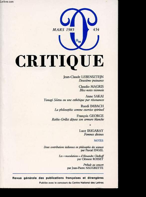 Revue générale des publications française et étrangères. Deuxième puissance. Bloc notes viennois. Yanagi soetsu ou une esthétique par résonances. La philosophies comme exercices spirituel.. Robert Grillet dépose son armure blanche..... Classification Dewey : 100-PHILOSOPHIE ET DISCIPLINES CONNEXES