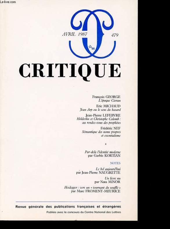 Revue générale des publications française et étrangères. L époque de Cioran. Jean Arp ou le sens du hasard. Sémantique des noms propres et essentialisme. Le bel aujourd hui. Classification Dewey : 100-PHILOSOPHIE ET DISCIPLINES CONNEXES