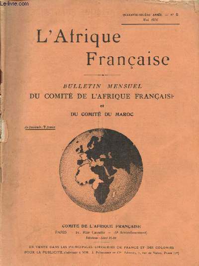 Comité de l'Afrique française et du Comité du Maroc. 1936. In-4. Relié. Etat d'usage, Couv. défraîchie, Agraffes rouillées, Papier jauni. Paginé de 250 à 308 , augmenté de quelques photos et cartes en noir et blanc,dans le texte. Texte sur 2 colonnes. Relié par 2 agraffes.. . . . Classification Dewey : 70.49-Presse illustrée, magazines, revues