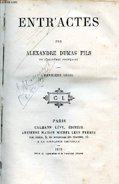 Calmann Lévy. 1878. In-8. Relié. Bon état, Couv. convenable, Dos satisfaisant, Intérieur frais. 376 pages. Titre et auteur inscrits au dos, à l'encre. Annotation en page de titre. 2 photos disponibles.. . . . Classification Dewey : 840.08-XIX ème siècle
