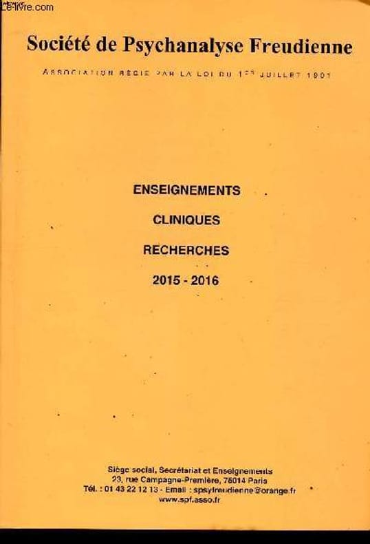 "Société de Psychanalyse Freudienne. 2015. In-8. Broché. Etat d'usage, Coins frottés, Dos satisfaisant, Intérieur frais. 118 pages, en supplément deux plaquettes dépliantes de 3 volets à 6 pages ""Journées d'études Samedi 14 novembre et dimanche 15 novembre 2015 L'intelligence Inconsciente"" et Journée d'étude Samedi 10 octobre 2015 Filiations et actualité de Gisela Pankow"".. . . . Classification Dewey : 150-Psychologie"