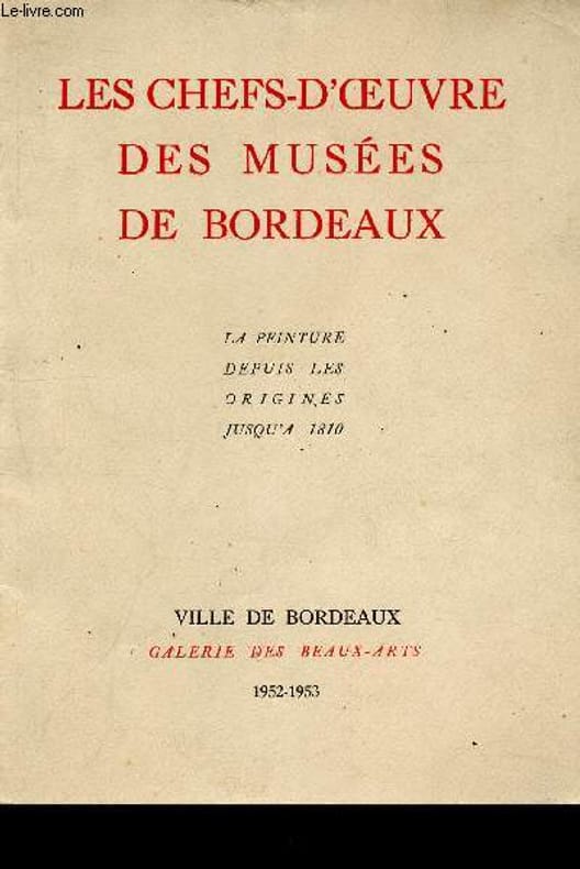 Ville de Bordeaux / Galerie des Beaux-Arts. 1953. In-8. Broché. Etat d'usage, Coins frottés, Dos frotté, Intérieur frais. 36 pages, nombreuses planches de reproductions en noir et blanc.. . . . Classification Dewey : 708-Galeries, musées, collections d'art