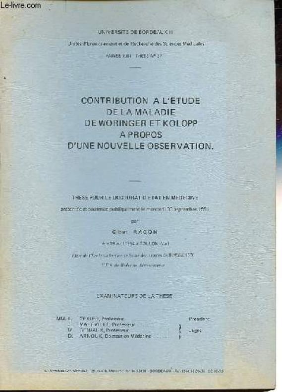 A compte d'auteur. 1981. In-4. Broché. Etat d'usage, Couv. partiel. décollorée, Dos satisfaisant, Papier jauni. 72 pages dactylographiées, nombreux tableaux en noir et blanc hors texte - coins frottés.. . . . Classification Dewey : 610-Sciences médicales. Médecine