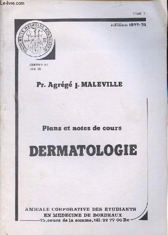 Amicale corporative des étudiants en Médecine de Bordeaux. 1978. In-4. Broché. Etat d'usage, Couv. légèrement pliée, Dos plié, Quelques rousseurs. 55 pages dactylogrzaphiées, un schéma en noir et blanc hors texte - coins frottés, papier jauni.. . . . Classification Dewey : 616.5-Dermatologie