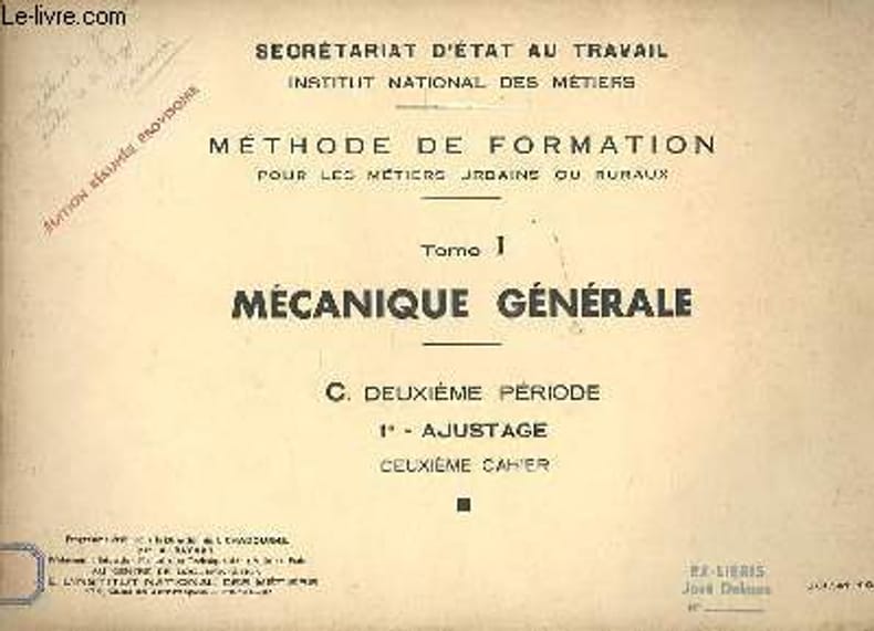 Institut National des Métiers. 1942. In-4. Broché. Etat d'usage, Tâchée, Agrafes rouillées, Quelques rousseurs. non paginé, 24 pages agrafées, nombreuses illustrations en noir et blanc dans le texte - papier jauni, coins frottés, étiquette sur le dos, annotation au crayon papier et ex-libris José Delmas sur le 1er plat, coiffe en tête abimée.. . . A l'italienne. Classification Dewey : 370-Education
