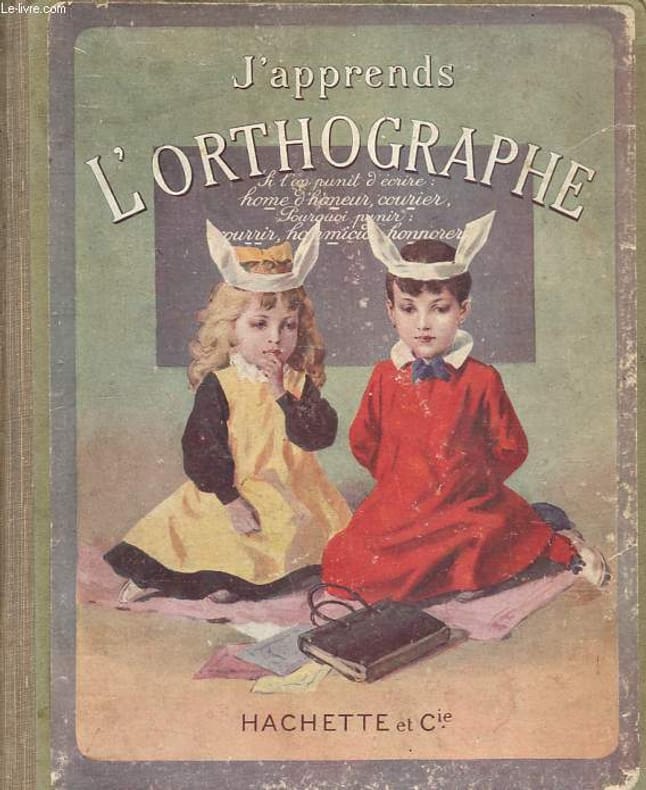 Robert Tinant, Eugène Le Mouel Hachette 21 x 25,5 Paris Cartonnage de l'éditeur sur fond vert, dos de toile grise, couverture illustrée contrecollée représentant deux écoliers affublés de bonnets d'âne, s.d., [début XXe], 64 p. En sous titre : l'orthographe de l'avenir par Mademoiselle H.S. Brès [1855-1919), album illustré de 256 gravures en noir et en couleurs. Chaque page est articulée autour d'une lettre et de sons accompagnées de nombreux petits exercices et d'illustrations (Robert Tinant, Badeilhac, Eugène Le Mouel...), dont deux planches hors texte en couleurs. Manuel intéressant pour l'histoire de la pédagogie de l'orthographe. Très légère et petite éraflure sur la couverture, la première planche en couleurs est coupée en haut de la page, sinon exemplaire en très bon état.(ApC122) Livre