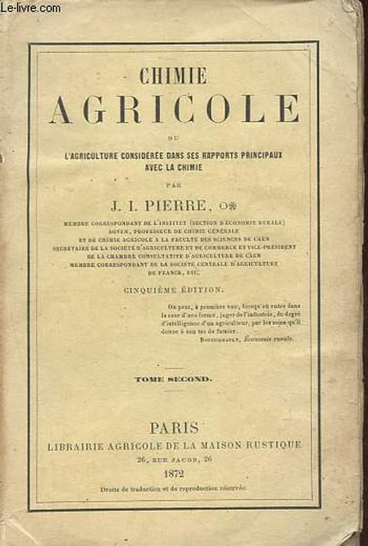 Librairie agricole de la Maison rustique. 1872. In-12. Broché. Etat d'usage, Couv. légèrement pliée, Manque en coiffe de pied, Quelques rousseurs. 364 pages - papier jauni, pliures en coins de quelques pages, 1er plat et quelques pages partiellement désolidarisés, dos plié et partiellement fendu, 1er plat et quelques pages rognés en coin en pied.. . . . Classification Dewey : 631.4-Science des sols : chimie, physique, fertilité